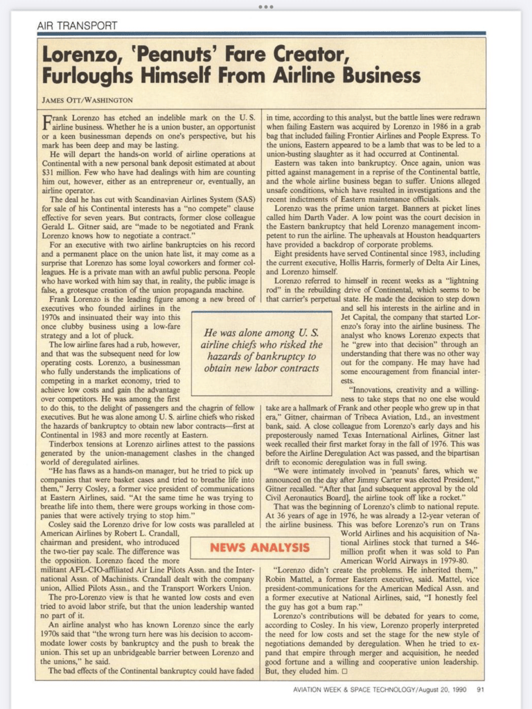 Frank was the Enfant Terrible of the U.S. airline industry after it was deregulated. He is writing a book that should be interesting. He bought airlines. He merged them. He fought unions all the way. In the end a bankruptcy judge banned him from the industry. I wrote this news analysis in 1990.